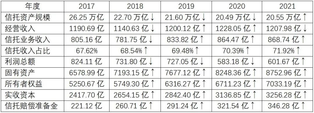 ÌØÊâÐèÒªÖ¸³öµÄÊÇ£¬ËäÈ»×Ô2018ÄêÒÔÀ´ÐÅÍÐÒµ´¦ÓÚתÐÍÉú³¤µÄµ÷½âÏÂÐÐÆÚ£¬ÐÅÍйæÄ£Ò»Á¬Ï½µ£¬Ä±»®ÊÕÈëʱÔöʱ¼õ£¬µ«×÷ΪÖ÷ÒµµÄÐÅÍÐÓªÒµÊÕÈë³ý2018Äê¶ÈС·ùϽµ2.91%Í⣬ØÊºóÄê¶ÈÔòÒ»Ö±ÎÈÖÐÓÐÉý£¬ÔÚı»®ÊÕÈëÖеÄÕ¼±È¸üÊÇÖðÄêÎȹÌÌáÉý£¬ÐÅÍÐÖ÷ҵְλÏ൱Îȹ̡£2021Äêµ×£¬È«ÐÐҵʵÏÖÐÅÍÐÓªÒµÊÕÈë868.74ÒÚÔª£¬Í¬±ÈÔöÌí0.49%£¬Ïà±È2017ÄêËÄÄê¼ä×ܼÆÔöÌíÁË7.90%£»ÐÅÍÐÓªÒµÊÕÈëÕ¼±ÈΪ71.92%£¬Í¬±ÈÌáÉýÁË1.53¸ö°Ù·Öµã£¬Ïà±È2017ÄêËÄÄê¼ä×ܼÆÌáÉýÁË4.30¸ö°Ù·Öµã¡£