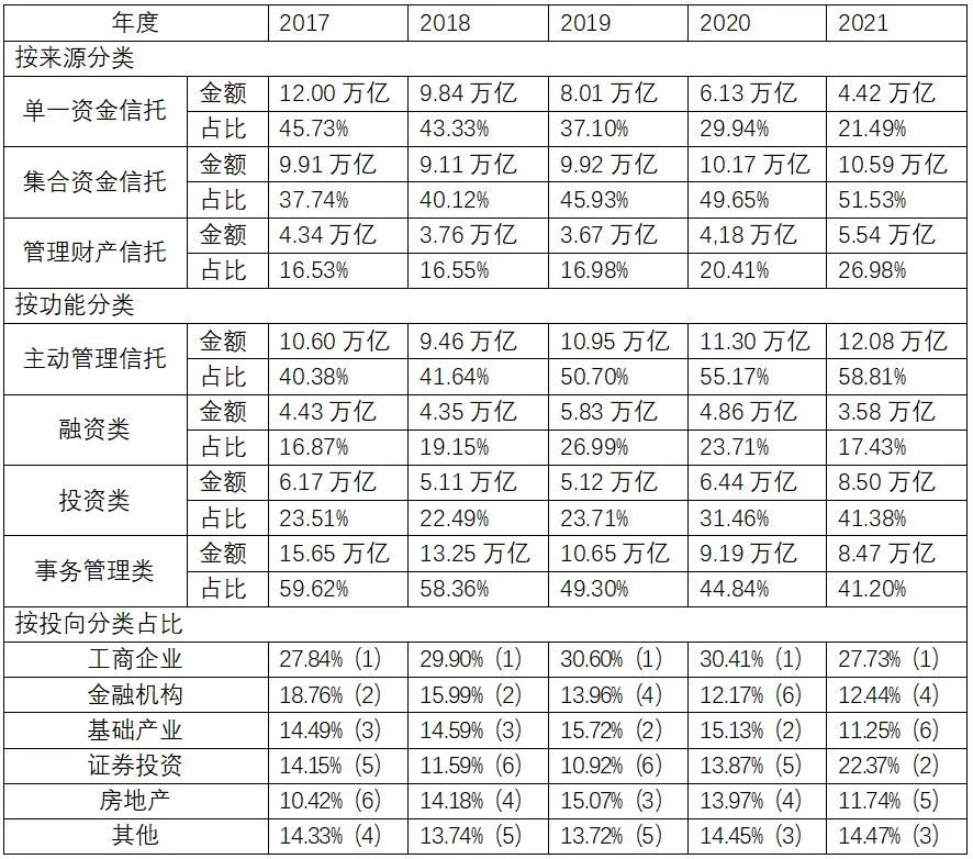 2021Äêµ×£¬ÈÚ×ÊÀàÐÅÍйæÄ£½µÖÁ3.58ÍòÒÚÔª£¬±ÈÉÏÄêβѹËõÁË1.28ÍòÒÚÔª£¬½µ·ù¸ß´ï26.28%£»Õ¼±È½µÖÁ17.43%£¬±ÈÉÏÄêβϽµÁË6.28¸ö°Ù·Öµã£¬¹æÄ£ÓëÕ¼±ÈµÄÄê¶È½µ·ù¾ùΪ½üÄêÀ´×î´ó¡£Óë2019Äê·åÖµÏà±È£¬Á½Äê¼äÈÚ×ÊÀàÐÅÍйæÄ£×ܼÆÑ¹½µÁË2.25ÍòÒÚÔª£¬½µ·ù×ܼƴï38.60%£¬Õ¼±È×ܼƻØÂäÁË9.57¸ö°Ù·Öµã£¬Ñ¹½µÐ§¹ûÏÔÖø£¬ÈÚ×ÊÀàÐÅÍÐÒѲ»ÔÙÊÇ×Ô¶¯ÖÎÀíÐÅÍеÄÖ÷µ¼²úÆ·¡£Óë´Ëͬʱ£¬2021Äêµ×£¬Í¶×ÊÀàÐÅÍйæÄ£ÔòÔöÖÁ8.50ÍòÒÚÔª£¬±ÈÉÏÄêβÔöÌíÁË2.06ÍòÒÚ£¬Ôö·ù¸ß´ï31.92%£»Õ¼±ÈÔòÔöÖÁ41.38%£¬±ÈÉÏÄêβÉÏÉýÁË9.92¸ö°Ù·Öµã£¬¹æÄ£ÓëÕ¼±ÈµÄÄê¶ÈÔö·ù¾ùΪ½üÄêÀ´×î´ó¡£Óë2017Äê6.17ÍòÒÚÔª¹æÄ£ºÍ23.51%Õ¼±ÈÏà±È£¬Í¶×ÊÀàÐÅÍÐËÄÄê¼ä¹æÄ£×ܼÆÔöÌíÁË2.33ÍòÒÚÔª£¬Ôö·ù×ܼƴï37.80%£¬Õ¼±È×ܼÆÌáÉýÁË17.87¸ö°Ù·Öµã£¬ÒѾ³ÉΪ×Ô¶¯ÖÎÀíÐÅÍÐ×îÖ÷ÒªµÄ²úÆ·ÐÎʽ¡£